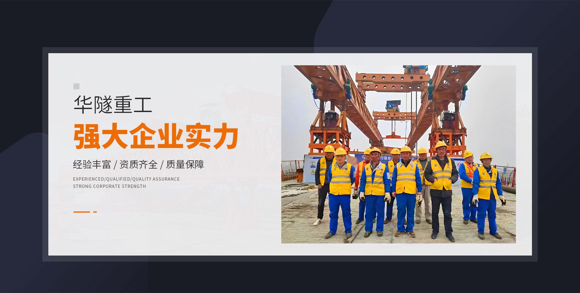 河南華隧重工機械裝備有限公司主要從事通用門式起重機、橋式起重機、電動單梁起重機,輪胎式起重機、架橋機、提梁機、遠梁平車、鋼絲繩電動萌蘆、卷揚機、起重配件制造、銷售:起重機械租賃、安裝和維修,起重設備園收,機械設備維修,鋼結構工程承包,橋梁工程及技術咨淘服務,銷售五金制品、機電設備:建設工程監理,建設工程設計,各類工程建設活動,建筑勞務分包,建筑物折除作業,施工作業,工程管理服務,土石方工程施工,裝如發運。  公司已通過IS0國際質量、環境、健康與安全三合一標準認證,特種設備制造許可證和特種設備安裝改造維修許可證。擁有完熟的質量管理體系。嚴格的管理制度,強大的生產能力和先進的檢測手段,在保證產品質量的同時,也具備了極強的市場競爭力。  公司堅持科技創新為理念,產品質量為核心,注重信譽,建立了減信可靠、快捷、思速。便利周到的售后服務網絡。  我們擁有的技術專家和技術服務隊伍為客戶提供充善的售前技術支持和全天候的售后服務體系,讓您無后顧之憂,享受一站式的超值服務。  “華隧重工,伴您成功“是華隧重工永遠的宗指,真被的希望與各界朋友攜手并進。共創輝準!